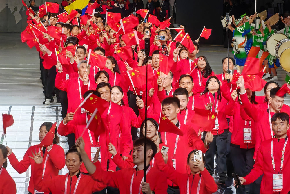 图为11月15日,中国体育代表团在第25届夏季听障奥运会开幕式上入场