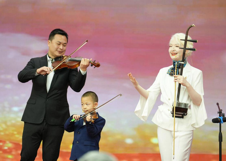 图为1月29日,中国残疾人艺术团演员俞彧(右)一家在中国残联2026年迎新春中外交流活动上表演