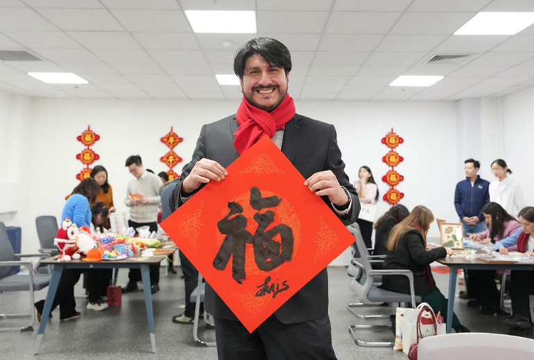 图为1月29日,在中国残联2026年迎新春中外交流活动上,外国嘉宾展示他书写的福字
