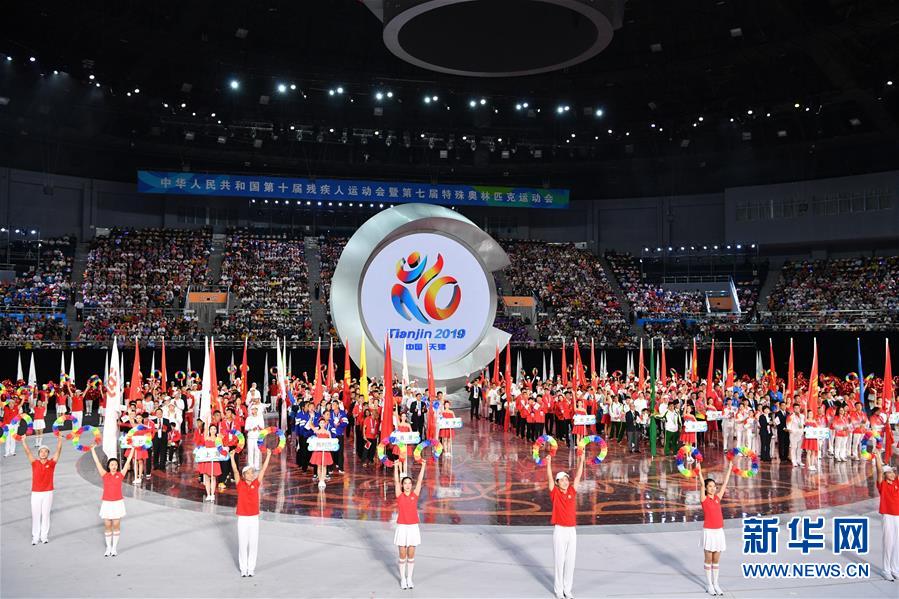 新华社照片,天津,2019年8月25日 (体育)(7)全国第十届残运会暨第七届特奥会开幕式在天津举行 8月25日,旗手护送中华人民共和国第十届残疾人运动会暨第七届特殊奥林匹克运动会会旗进入开幕式现场。 当日,中华人民共和国第十届残疾人运动会暨第七届特殊奥林匹克运动会开幕式在天津体育馆举行。 新华社记者李然摄