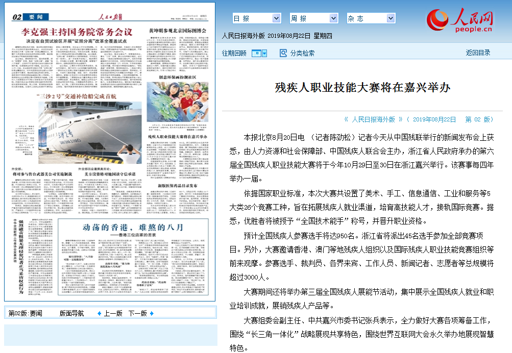 人民日报海外版 残疾人职业技能大赛将在嘉兴举办