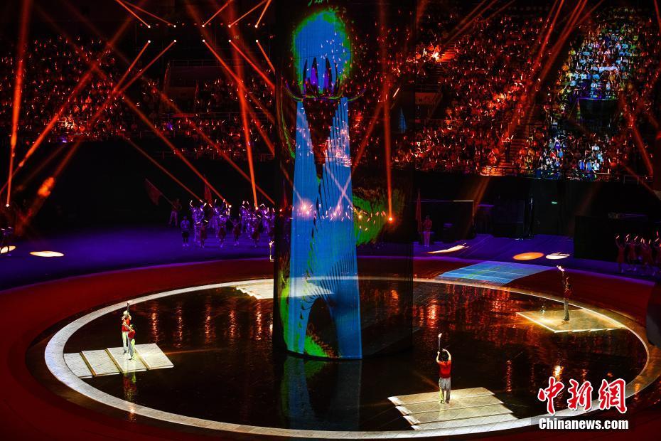 8月25日,火炬手共同点燃圣火。当晚,中华人民共和国第十届残疾人运动会暨第七届特殊奥林匹克运动会开幕式在天津体育馆举行。中新社记者 佟郁 摄