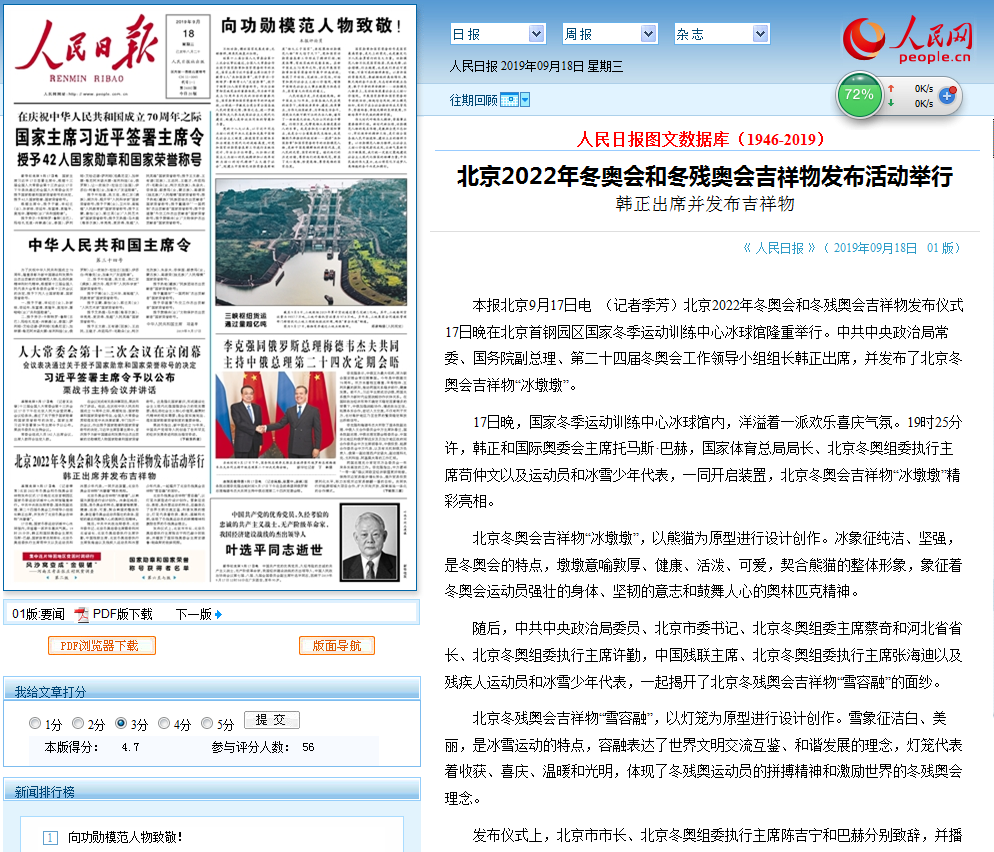 人民日报 北京2022年冬奥会和冬残奥会吉祥物发布活动举行 韩正出席并发布吉祥物