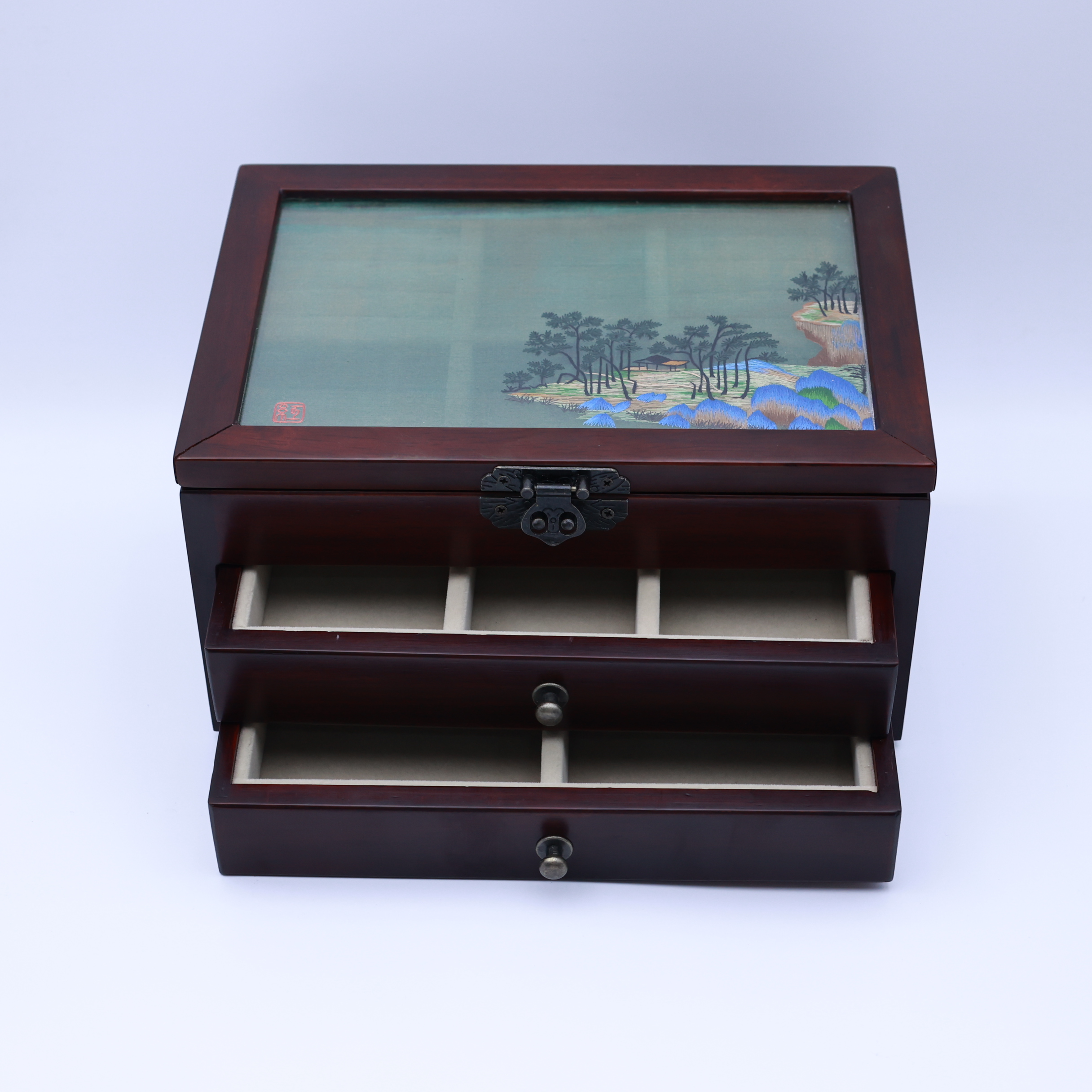 作品简介:该作品为双面蜀绣文具用品。木质首饰盒整体风格清新典雅,盒盖蜀绣画面借用北宋王希孟青绿山水画作品《千里江山图》片段,以