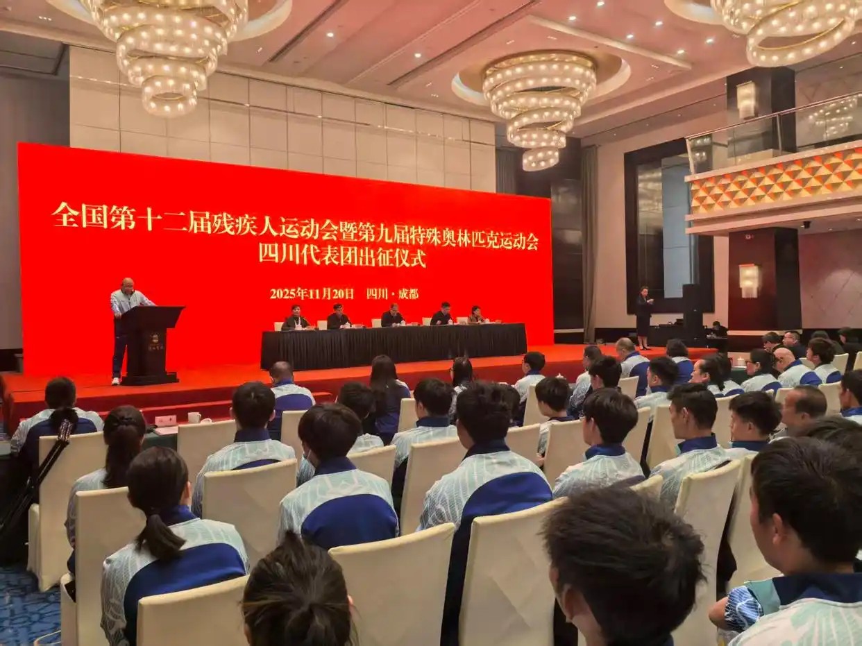 11月20日,全国第十二届残疾人运动会暨第九届特殊奥林匹克运动会四川体育代表团出征动员活动在成都举行。四川副省长、代表团团长胡云为代表团授旗并作出征动员讲话,四川省残联理事长、代表团副团长吴立岩接旗。