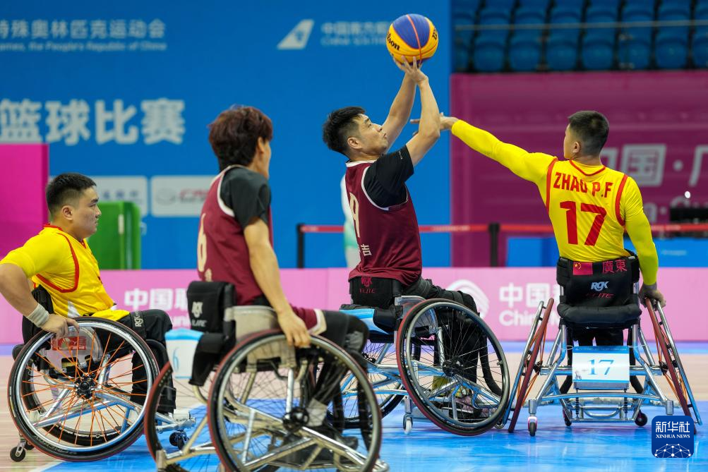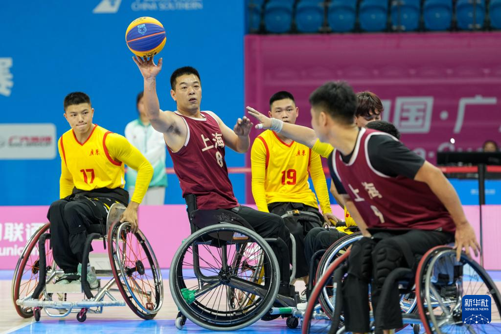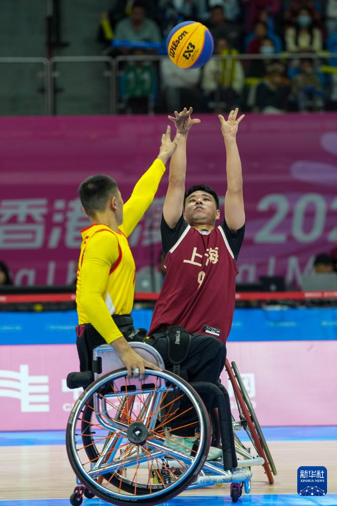 当日,在全国第十二届残疾人运动会暨第九届特殊奥林匹克运动会轮椅篮球项目男子三人篮球小组赛中,上海队14比2战胜广东一队。