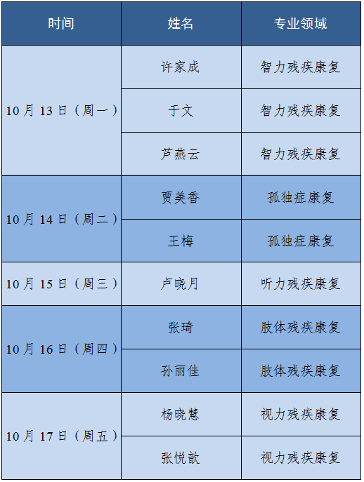 二、在线专家咨询时间为每周一至周五8:30-16:30。每日一类残疾类别:分别是周一智力残疾,周二孤独症,周三听力残疾,周四肢体残疾,周五视力残疾。如遇节假日,提问安排顺延。